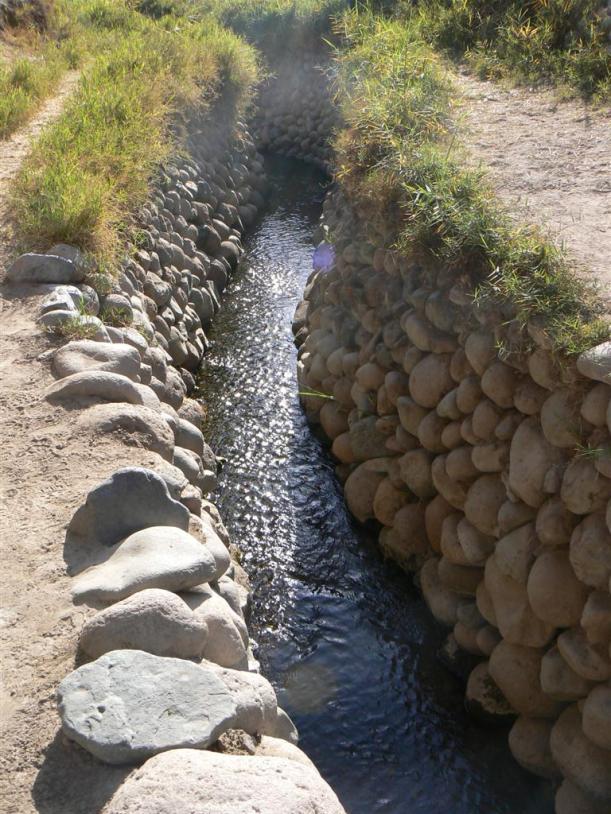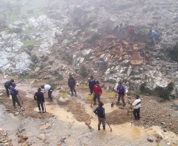 En los lugares donde hay pendientes muy fuertes, cuando llueve las quebradas (conjunción de dos laderas que forma un conducto cóncavo) llevan mucha agua pero al cabo de poco tiempo se agota. Para aprovecharla mejor se bloquea la quebrada y se fuerza otro camino para llevar el agua hasta un sitio plano reduciendo la pendiente del camino y, por tanto, la velocidad. El agua se infiltra por la tierra, hacia abajo, conviertes agua superficial en agua subterránea. Mil metros más abajo reaparece como manantiales. ¿Cómo sabían que iba a salir por allí un manantial? Hay muchos ensayos detrás, son trabajos que no son cien por cien seguros y que no se resuelven en un día, esa agua se demora unos dos o tres meses hasta que vuelve a aparecer. Una ONG de Perú, CONDESAN, está llevando adelante una investigación con en Huamantanga, mandando colorantes con el agua que va por el canal, por eso nos dimos cuenta de que demora tanto tiempo. Calculan que alrededor del 40% del agua se recupera. La técnica se llama mamanteo porque amamantas a la Tierra con agua.