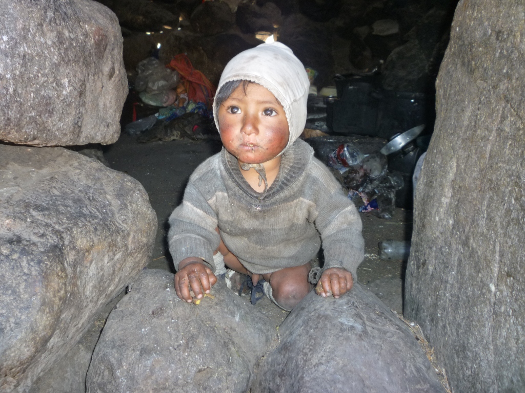 ….. al acercarnos a esta vivienda en el portal de la misma nos recibió la mirada extraviada de un niño de menos de un año, estaba este niño sin pantalón, solo con un pobre abrigo y con una papa en la mano, expuesto al violento aire de la puna.