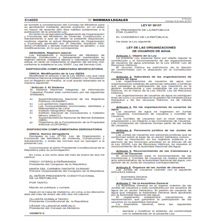 El 19 de enero del 2014 el presidente Ollanta Humala promulga la Ley de Organizaciones de Usuarios Nº 30175, una ley que regulará la gestión y la institucionalidad de las organizaciones de usuarios.