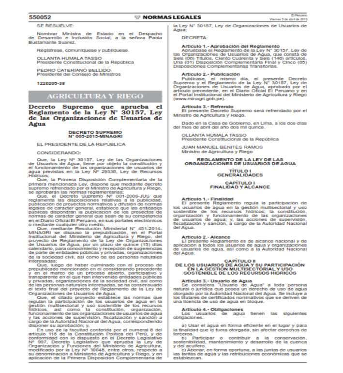 El viernes 03 de abril del 2015 se promulgó el D.S. 005-2015-MINAGRI, el mismo que aprueba el Reglamento de la Ley N° 30157, Ley de las Organizaciones de Usuarios de Agua.