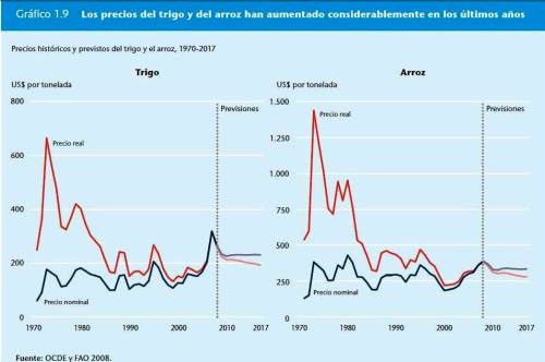 La agricultura es, con diferencia, el mayor consumidor de agua dulce. Aproximadamente el 70% de las extracciones de agua dulce se destinan a la agricultura de regadío. La escasez de agua podría limitar la producción y el abastecimiento de alimentos, con la consiguiente presión sobre los precios y una mayor dependencia de los países en las importaciones de alimentos. La creciente demanda de alimentos provocada por un aumento de la población y los cambios en los hábitos alimenticios, la caída en la producción de alimentos en algunos países, el encarecimiento de algunos productos agrícolas básicos como los fertilizantes (provocado a su vez por los costos de energía), los incentivos bioenergéticos en algunos países y una posible especulación financiera han contribuido a aumentar el precio de los alimentos considerablemente (véase gráfico 1.9).