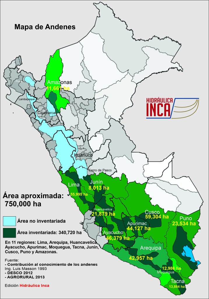 Los inventarios parciales que hace el Ing. Luis Masson Meiss (1982) señalan 152 375 ha en 5 regiones del país, indicando que Lima presenta una mayor cantidad de andenes.