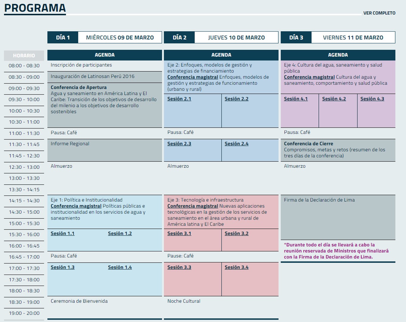 En este marco la Conferencia Latinosan Perú 2016, a realizarse del 9 al 11 de marzo del 2016, tiene como objetivo principal “Afianzar el compromiso y voluntad política de los países de la región en materia de políticas públicas y recursos fiscales para alcanzar el acceso universal a servicios de saneamiento de manera equitativa, considerando un enfoque multisectorial, de género, atención a la niñez y la protección del recurso hídrico”.