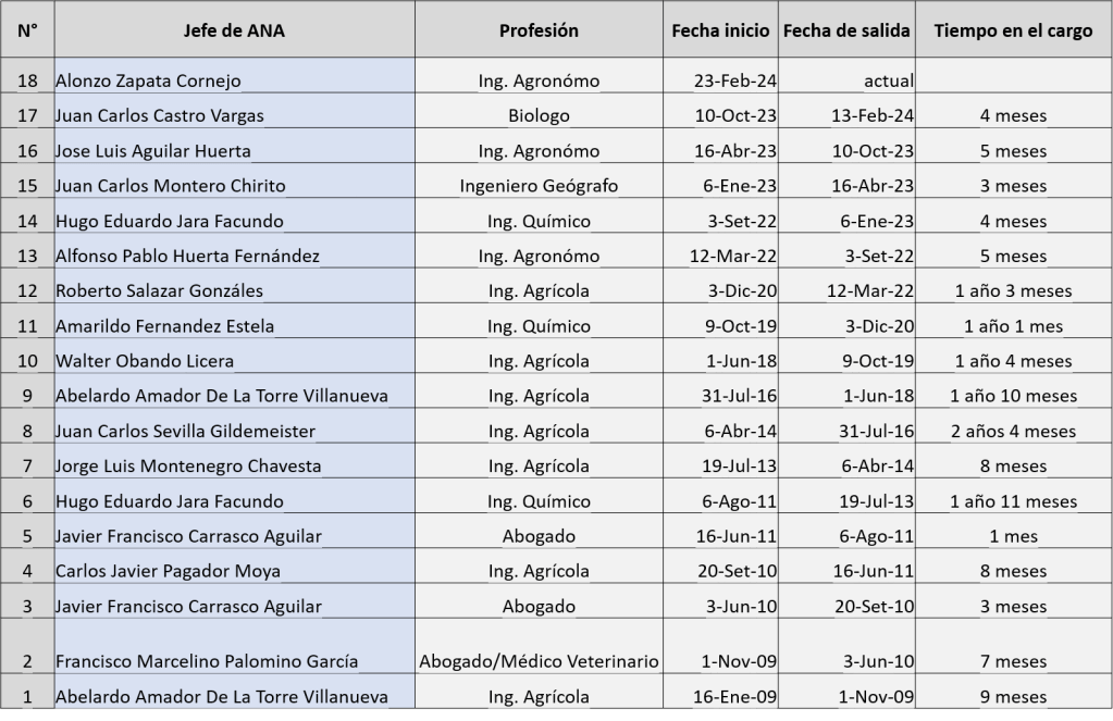 La ANA fue creada el 13 de marzo de 2008, en sus 16 años de funcionamiento, por ella han pasado 18 jefaturas, unas más efímeras que otras, también es necesario decirlo, unas más ineficientes que otras, sin ejercer el verdadero liderazgo que el sector hídrico requiere.