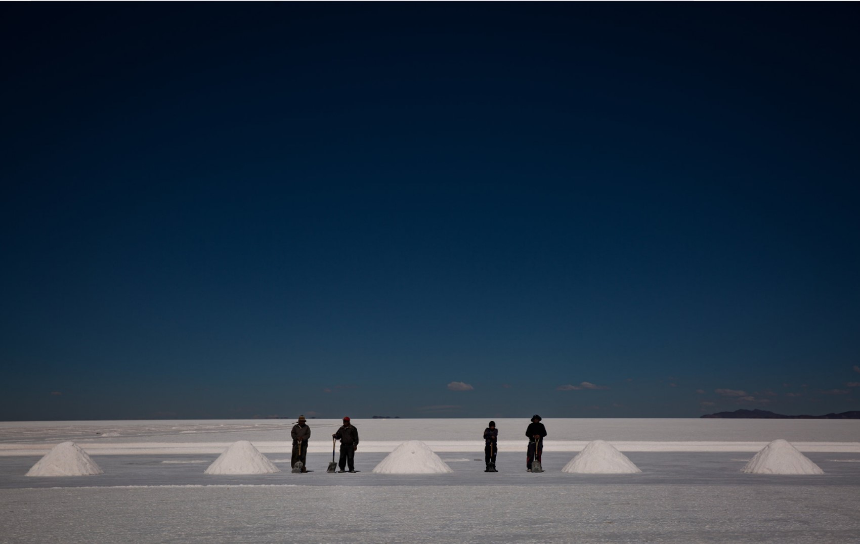 Afuera del molino, la vida es más dura. En la enorme salina cercana al pueblo de Colchani, donde se reubicaron decenas de urus, los jornaleros se alejan sobre camiones, cargando palas. Recolectan la sal mientras el sol cae a plomo y se refleja sobre la vasta expansión a sus pies.