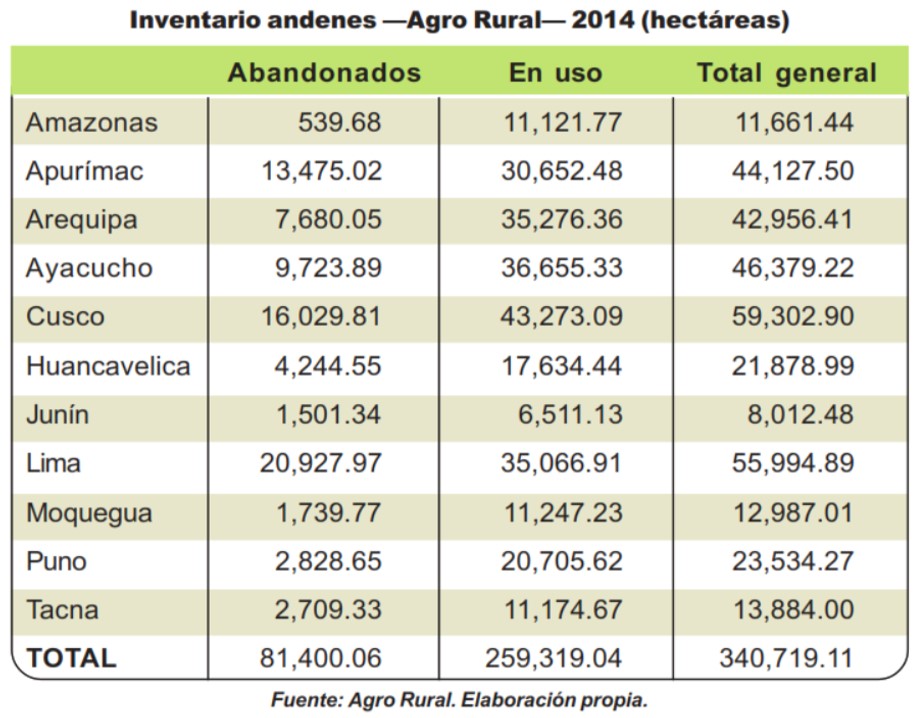 Sobre los sistemas de andenes en el Perú no tenemos un inventario final que nos indique el área real de este extraordinario legado.