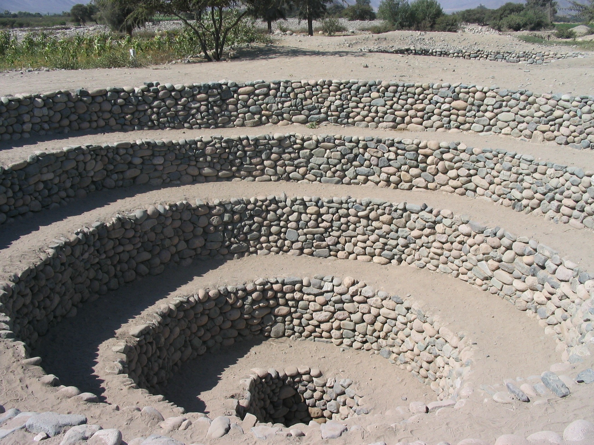 Chimenea de sección helicoidal hecha con canto rodado y sin aglomerante alguno En los tramos cubiertos techaron el canal para lo cual utilizaron lajas de piedra y listones de Huarango finamente colocados. La construcción de estos tramos cubiertos hace pensar que conocían técnicas de topografía subterránea, ¿como hacer para seguir la dirección adecuada con la pendiente óptima que mantenga el flujo uniforme necesario, con el fin de garantizar la durabilidad de la estructura?