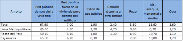 Según datos oficiales del INEI (Anuario de Estadísticas Ambientales del 2011) el abastecimiento del agua en el Perú presenta las siguientes cifras (% respecto del total de hogares)