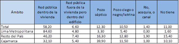 A nivel Nacional el 35.2% de los hogares del país no cuentan con un sistema de eliminación de excretas decente, como lo deben tener todos los hogares. En Cajamarca la cifra es mayor, el 65% de los hogares de Cajamarca no cuenta con un sistema de eliminación de sus excretas y más aún el 11% de los hogares simplemente los elimina a los cursos de agua a vista y paciencia de los gobernantes de turno.
