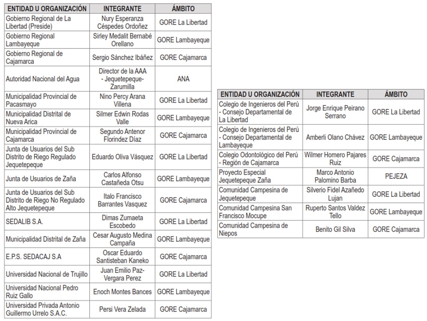 Este 08 de diciembre del 2016, mediante Resolución Jefatural Nro 316-2016-ANA la Autoridad Nacional del Agua reconoce a representantes de las organizaciones que integran el Consejo de Recursos Hídricos de Cuenca Interregional Jequetepeque – Zaña, según el siguiente detalle: