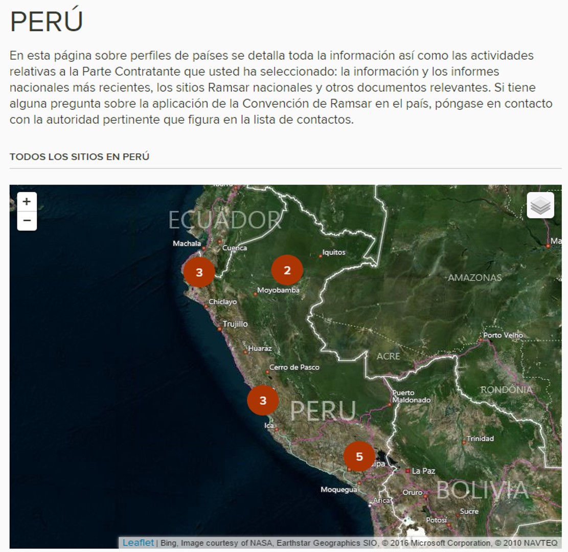 Hay más de 2.000 Sitios Ramsar en los territorios de más de 160 Partes Contratantes de Ramsar en todo el mundo. El Perú, país con un gran biodiversidad y ecosistemas participa en esta lista con 13 lugares: