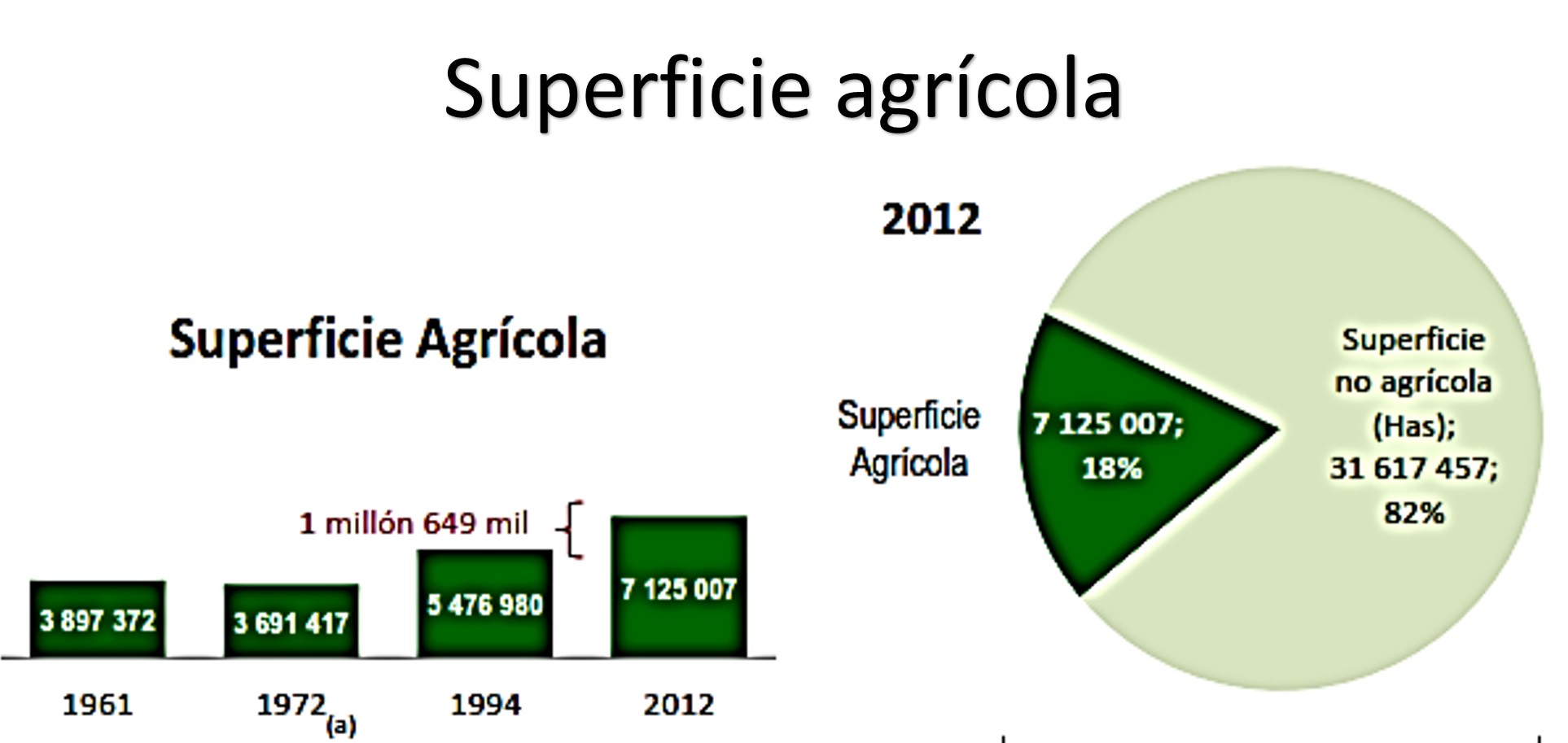 Pero queremos hacerlo con una reflexión y propuesta de acción. Sabemos que el principal usuario del agua es el sector agropecuario, de manera general señalamos que aproximadamente el 80% del agua dulce disponible se destina al sector agropecuario. De acuerdo al último censo nacional en nuestro país (2012) la superficie agrícola se ha incrementado de 3’897 372 ha (1961) a 5’476 980 ha (1994) y 7’125 007 ha (2012), es decir en el período de 1994 a 2012 (en 18 años) la superficie agrícola se ha incrementado en 1’648 027 ha.